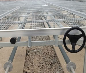 網面平整,焊接牢固,承重性好,尺寸準確,安裝施工方便,抗腐蝕耐用。主體結構材質采用鋁合金邊框網格為130㎜×30㎜(長×寬),熱鍍鋅材料,防腐性能高,承重能力好,壽命長可,左右移動較長距離,高度方向上可以進行微調具有防翻限位裝置,防止由于偏重引起的傾斜問題可在任意兩個苗床間產生約0.6(或0.8)米的作業通道。配置說明:溫室配置移動式苗床數量,根據育苗或生產實際用的溫室面積來定,使用壽命:編織網部分20年,其它結構25年。